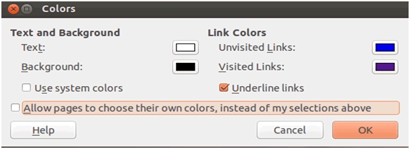 The second way I tested was by viewing the site with high contrast settings. Generally what this means is inverting the colors, so instead of black text on a white background, you have white text on a black background which can be easier to see for people with partial blindness. In Chrome there is a plugin to view pages in high contrast. Both Windows and Mac's have a high contrast mode in their desktop settings, which will show the entire screen in high contrast. In Firefox this involves going into the settings, preferences, content and colors, changing the text to white, the background to black then un-ticking the following option.