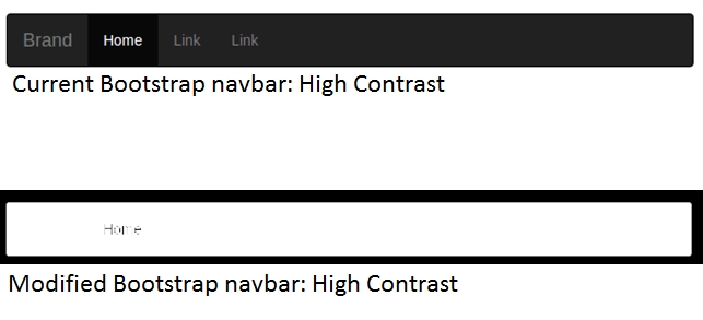 However this introduces a new problem: how to maintain the color for sighted users, however not using background-color in order to have it display in high-contrast settings. In Bootstrap 2 I found this was no problem as there were other CSS properties to control the look of the button, so removing the background-color had no visual impact to sighted users -- a 'win-win' there. In the custom GitHub repository mentioned, I've removed the background-color and replaced it with the CSS used in previous versions, slightly modified to meet the color contrast ratio and are also now visible in high contrast. Keep in mind, I only noticed this issue in Firefox. When checking this with high contrast in Chrome for example these buttons and inputs displayed fine. One thing that didn't though were Bootstraps inverted navbars. Ordinarily they look like this below.